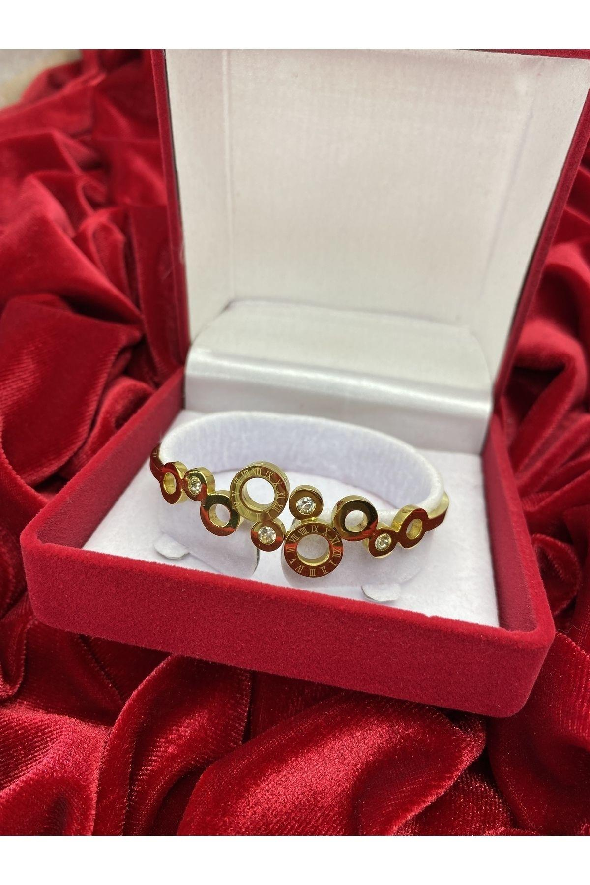 Zirkon taş detaylarıyla göz alıcı bir parlaklık sunan çelik bileklik, şıklığınızı tamamlar; Dayanıklı çelik materyali sayesinde uzun süreli kullanım için idealdir ve günlük aşınma ve yıpranmalara karşı dirençlidir; Altın rengi kaplaması ile klasik ve modern çizgileri bir arada barındırır, her türlü kıyafetle uyum sağlar;